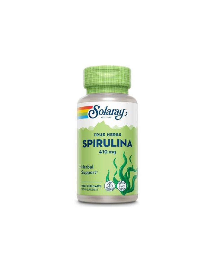 Solaray Spirulina 410mg contiene spirulina, un alga natural rica en nutrientes esenciales. Cada cápsula está cuidadosamente formulada para proporcionar spirulina de alta calidad.