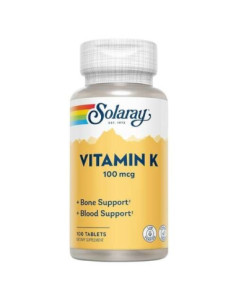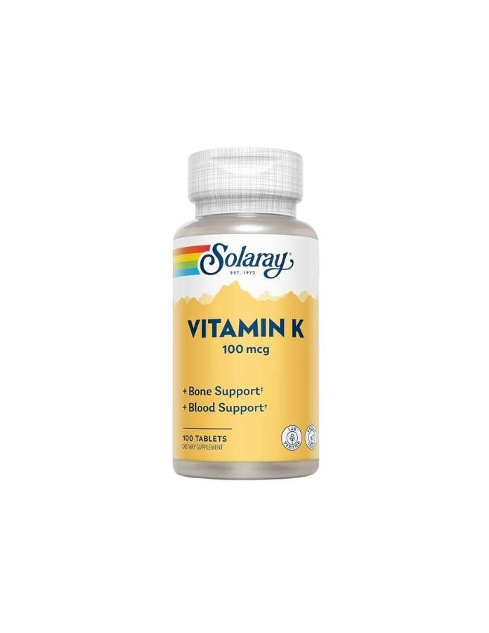 Solaray Vitamina K1 contiene como ingrediente activo principal la vitamina K1, conocida por su papel esencial en la coagulación sanguínea y el mantenimiento de una salud ósea adecuada. Este suplemento presenta una dosis de 100mcg por cápsula, diseñada para ayudar a satisfacer las necesidades diarias de vitamina K en el cuerpo humano.
